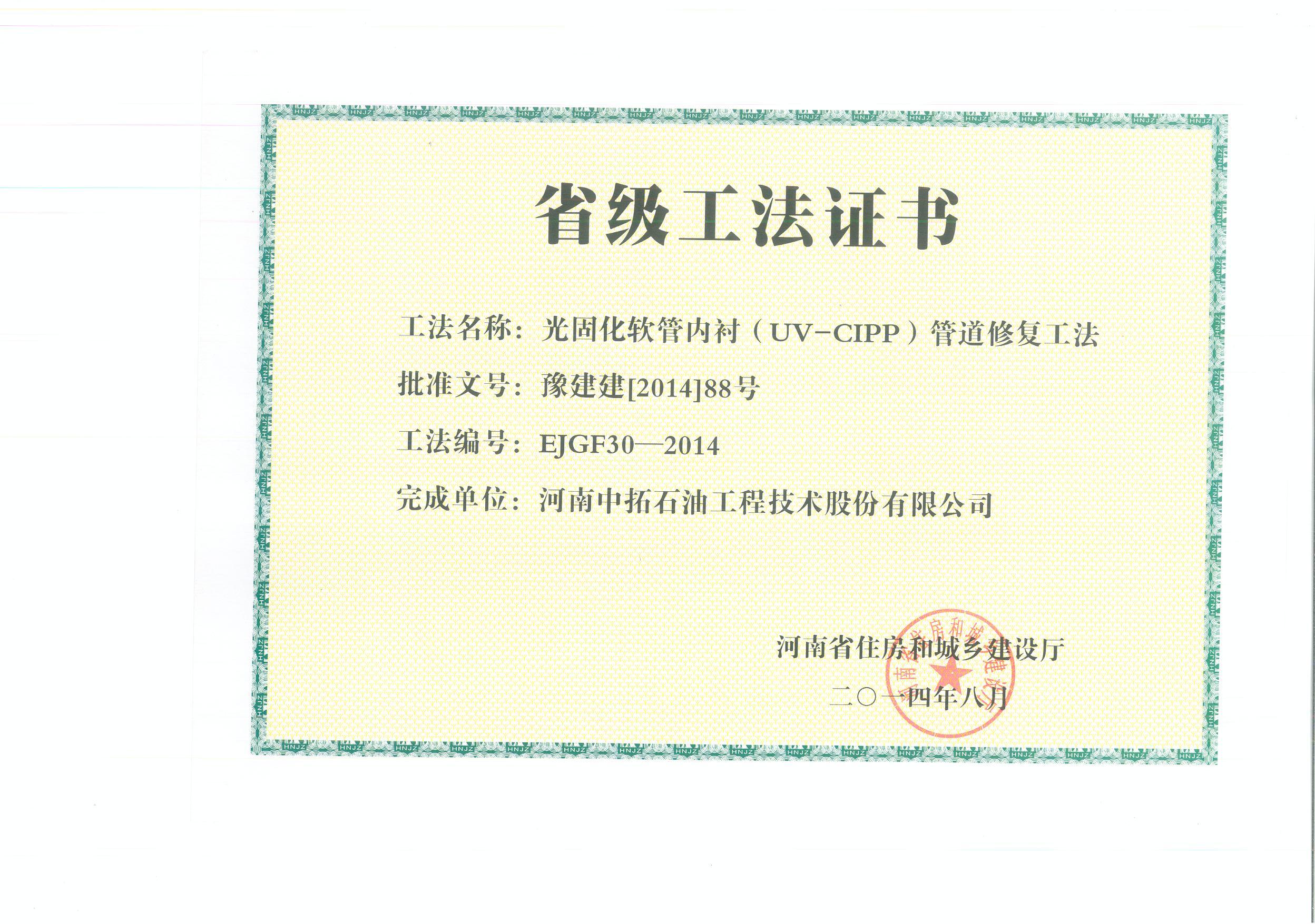 After reviewing by Henan Provincial housing and urban and rural construction office expert committee and public by the Internet, my company obtains Henan provincial construction methods, construction methods’ name is ‘light curing hose lining (UV - CIPP) pipeline repairing method’. The above methods gained shows that our company scientific research achievements has received government fully affirmation and recognition, and also shows the scientific research strength of company pipeline repairing, meantime make preparation for the future continuing to declare the national methods, and lay the foundation for declaring the government projects, science and technology brand and add construction research achievement.